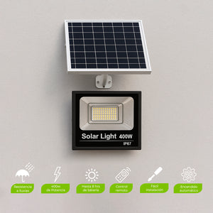 Reflector Solar LED 400W con Panel Solar y Control Remoto. Iluminación Total sin Costo de Electricidad.