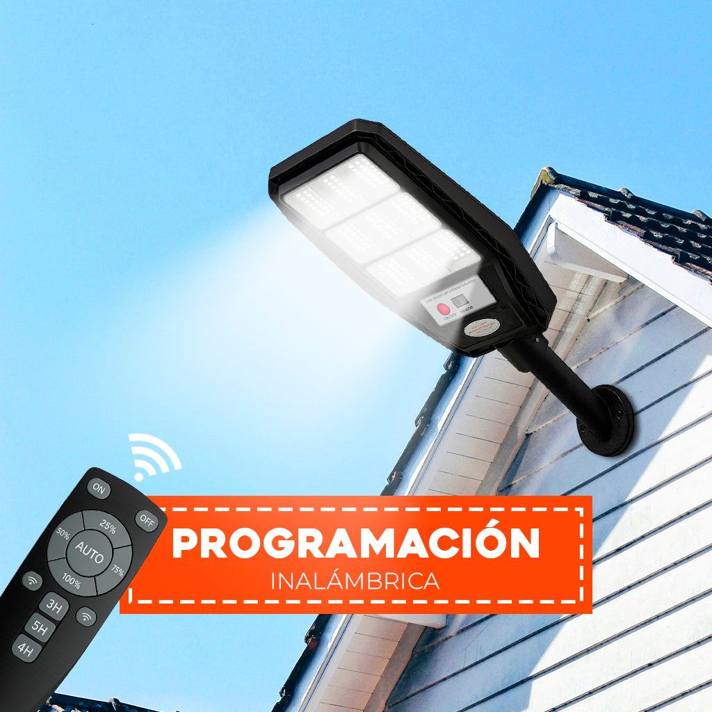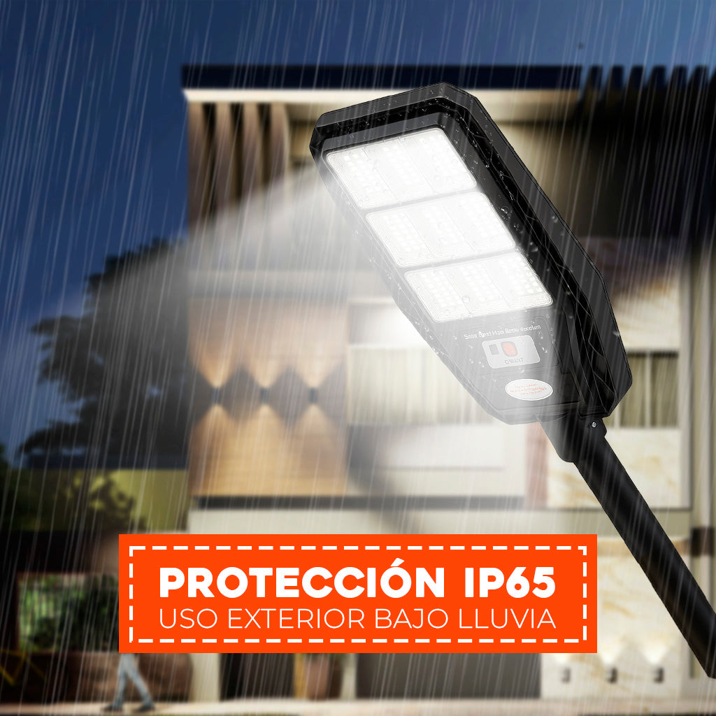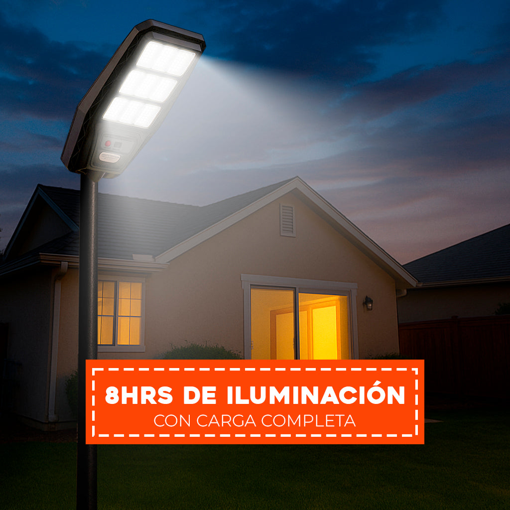 Foco para poste solar de 600 watt con 9 placas y 360 LED con control. Cuenta con gran intensidad de luz para instalar donde quiera. Se alimenta de luz solar, ideal para iluminar patio, ante jardín, calle, etc.
